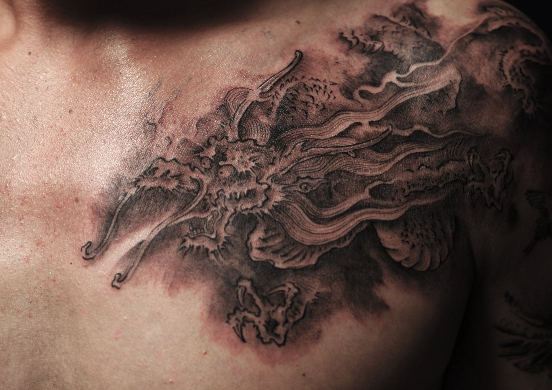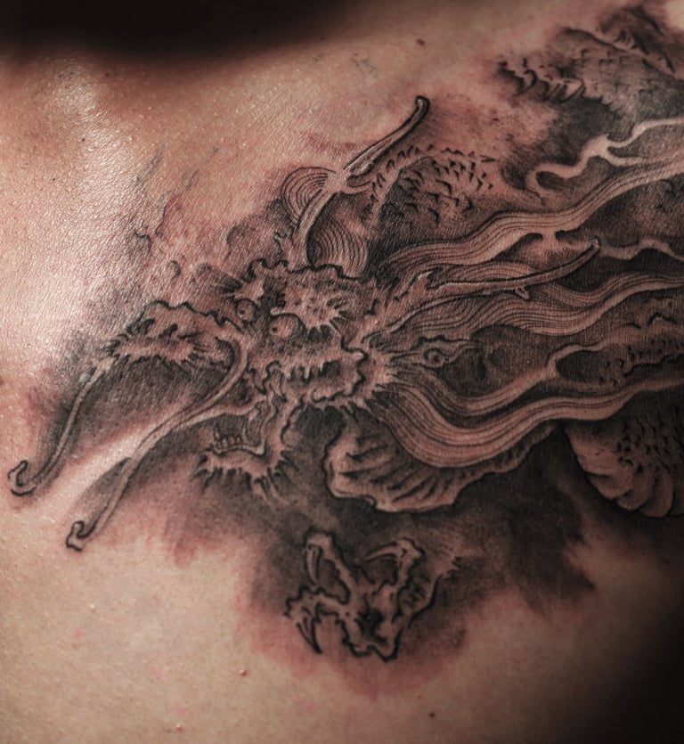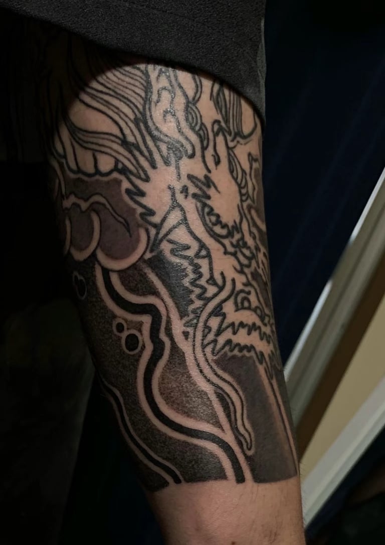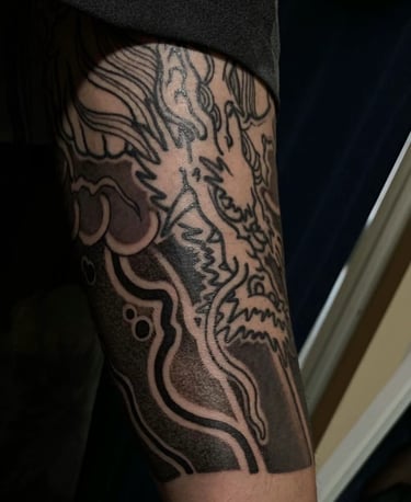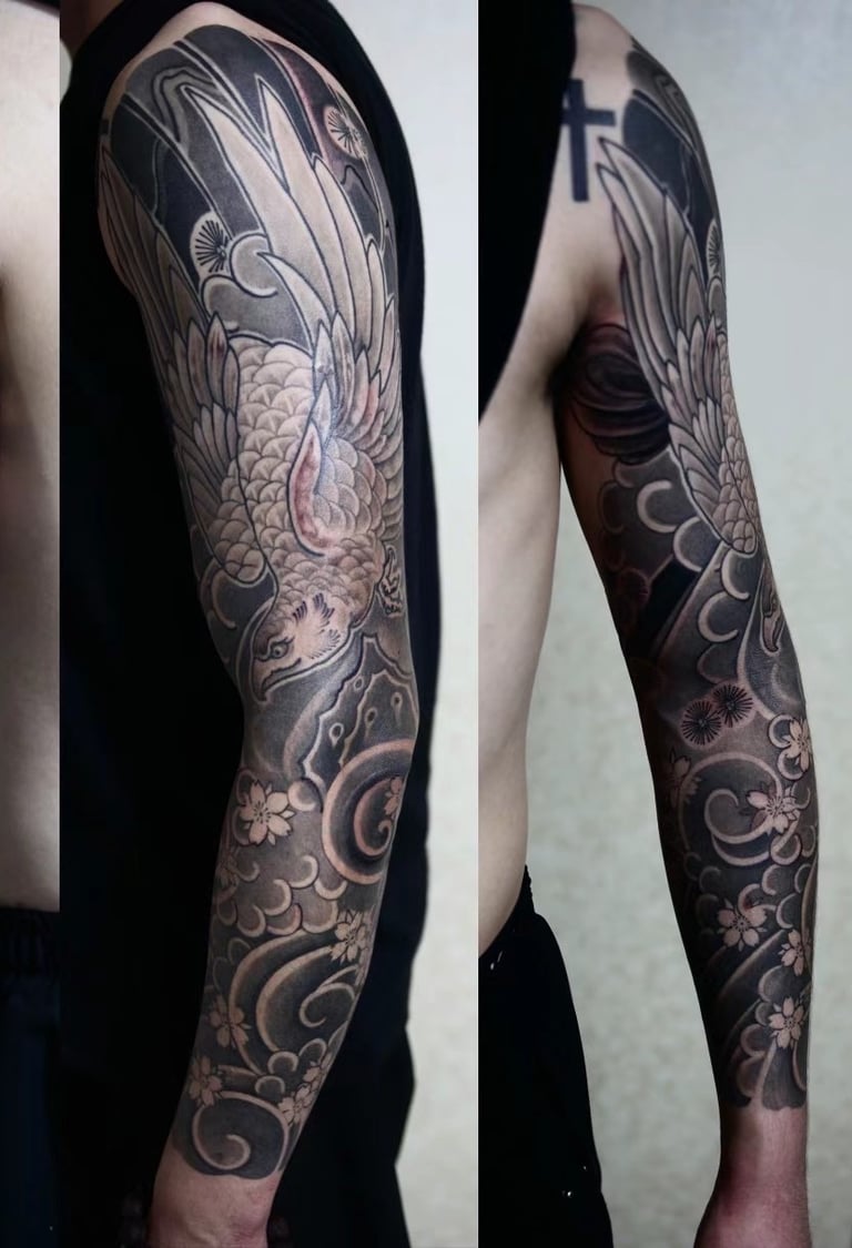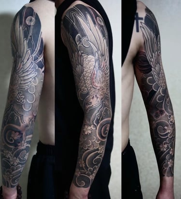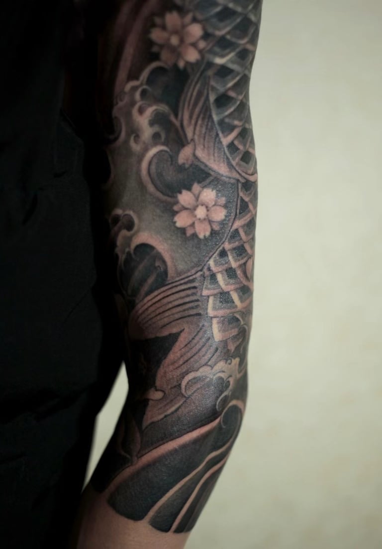 This tattoo, rendered in the Japanese style, extends across the entire arm. It is both classical and rich in symbolism.