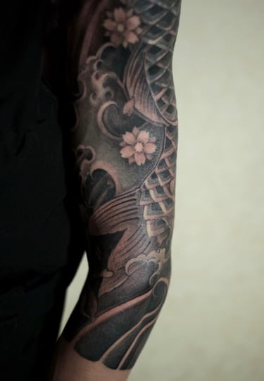 This sleeve-cover tattoo, designed with a koi fish and cherry blossoms, gracefully envelops the client’s entire arm.